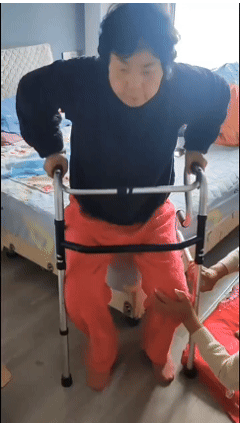 经过数次治疗,患者从完全不能自理,到人扶着可以站起来,再到扶着架子可以自行站立,情况一天比一天好!